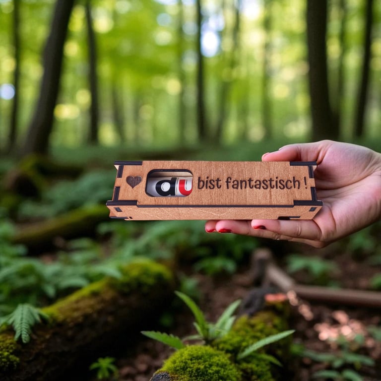 Unsere handgemachte Holzbox wird mit deinem Wunschtext graviert und enthält eine original Duplo‑Schokolade. Ideal für Geburtstage, kleine Überraschungen oder einfach so.