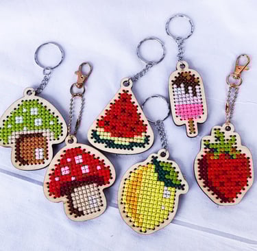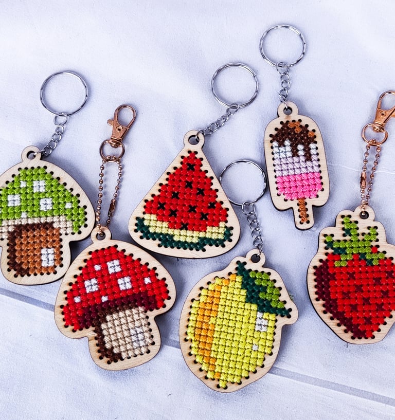 Liebevoll gravierte Holz-Schlüsselanhänger mit gestickten motiven – verspielt, bunt und perfekt als kleines Geschenk