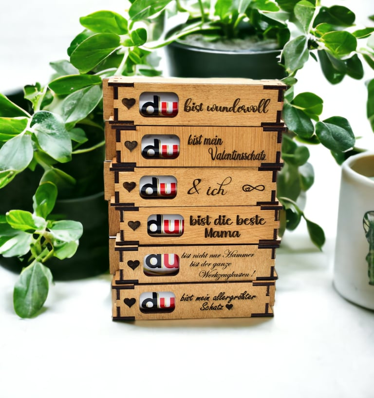 Liebevoll gravierte Holzbox für eine Duplo-Schokoladentafel – mit deinem Wunschtext personalisierbar. Ideal als kleine Aufmerksamkeit mit großer Wirkung.